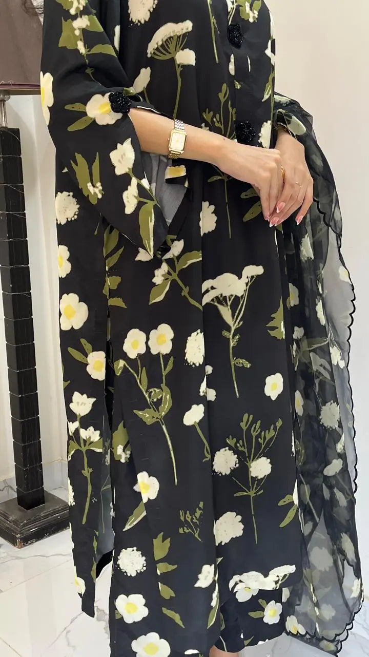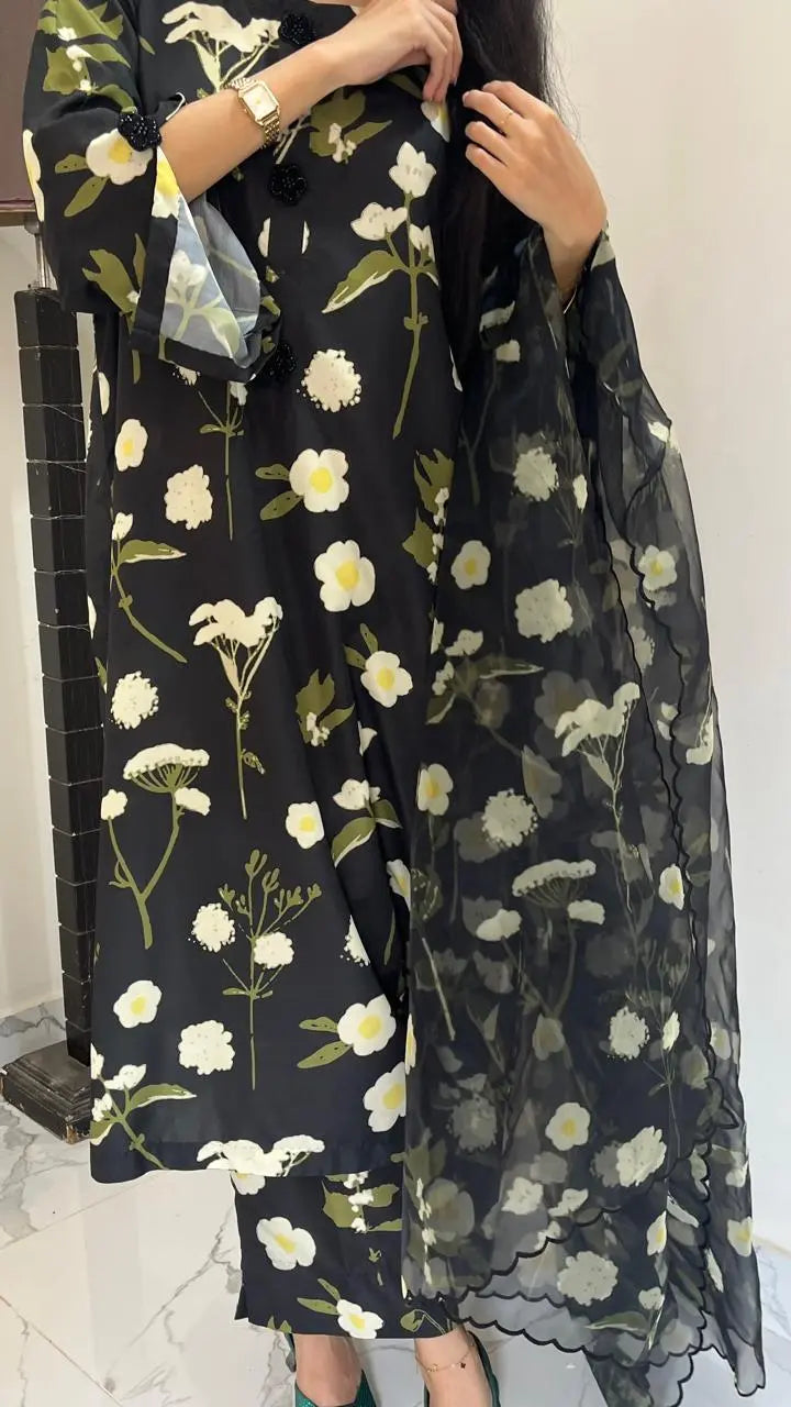 Crafted with elegance and sophistication, the Flora Edit Collection features premium raw silk fabric paired with a delicate organza dupatta. The luxurious raw silk ensures a smooth texture and graceful fall, making it perfect for both festive and formal occasions. Complemented with a sheer, lightweight organza dupatta, this outfit embodies timeless charm with a modern touch size small medium and large.